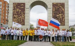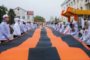 Рядом с мемориальным комплексом героям Великой Отечественной войны волонтёры развернули 80-метровую Георгиевскую ленту - символ доблести, стойкости и гордости за Великую Победу. Участники почтили память павших героев минутой молчания и возложили цветы к Вечному огню.