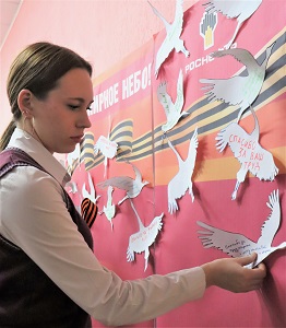 В завершении урока мужества школьники написали на бумажных журавлях слова благодарности поколению, подарившем нам Победу в Великой Отечественной войне. Поздравления и пожелания были размещены на стенде памяти.